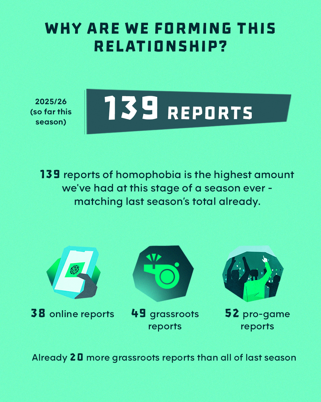 Since the 2019/20 season, 845 reports of homophobia have been submitted to the charity. 80% of these reports involve incidents of abuse from fans, with more than half involving abuse directed at players.